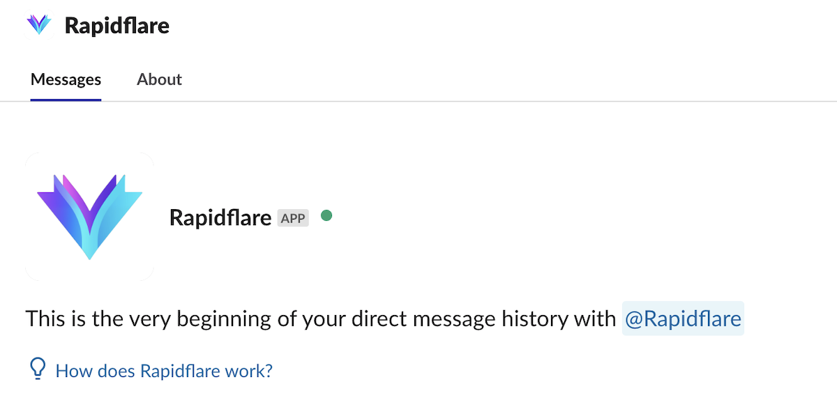 You can use /rf to start a conversation with Rapidflare at anytime in a DM or a channel.