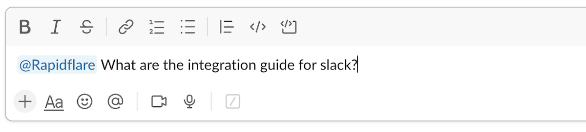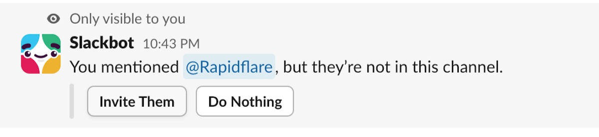 If our slack app is not yet in the channel where you do the "@" mention, Slack will ask if you'd like to Invite Rapidflare to the channel.