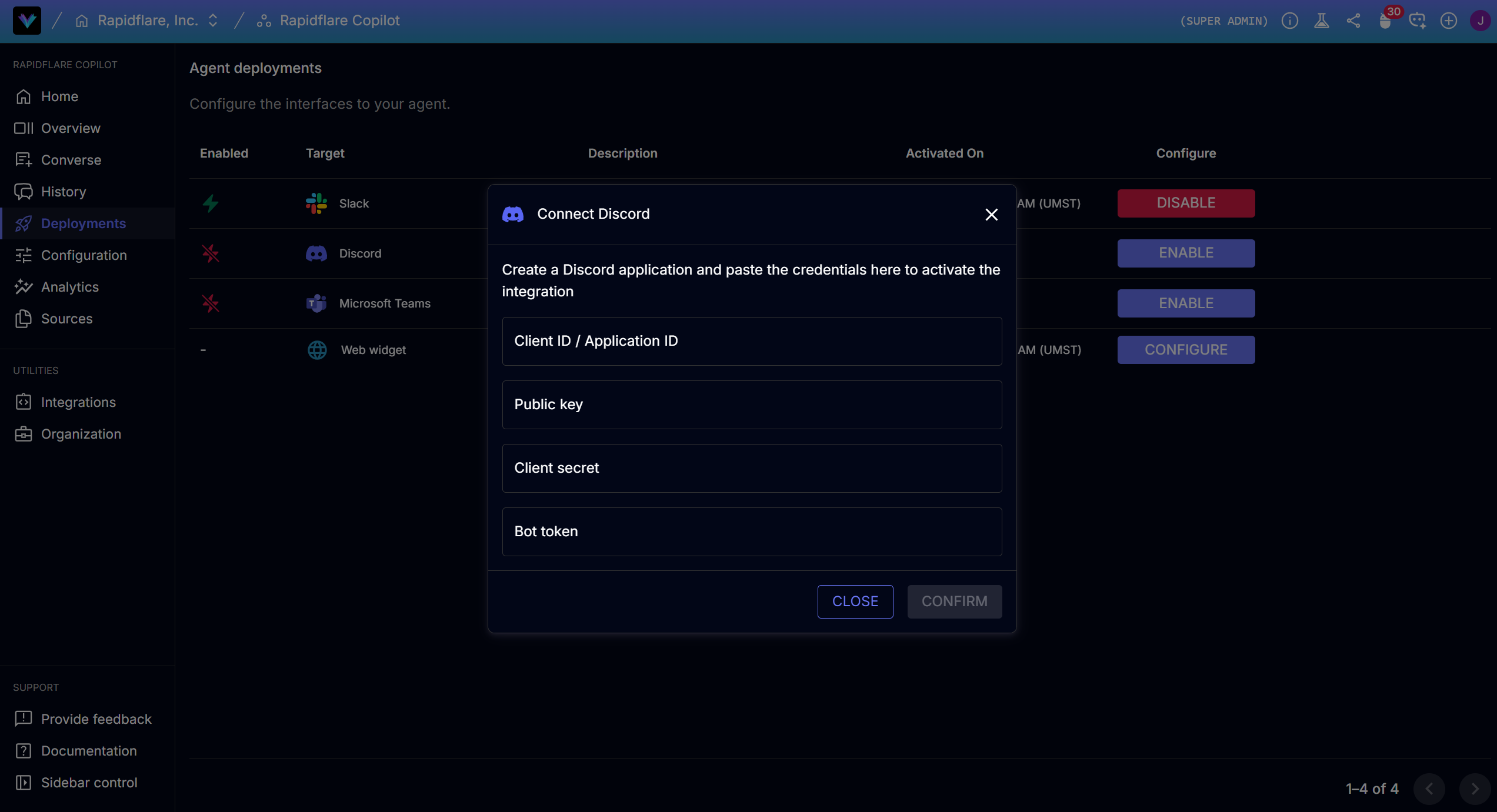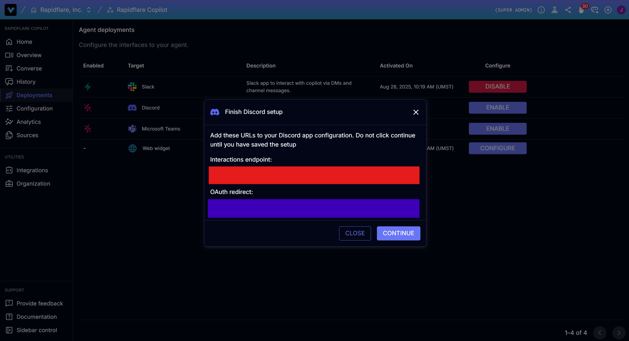 - Click Confirm. Rapidflare will generate the Interactions Endpoint URL and OAuth Redirect URL.