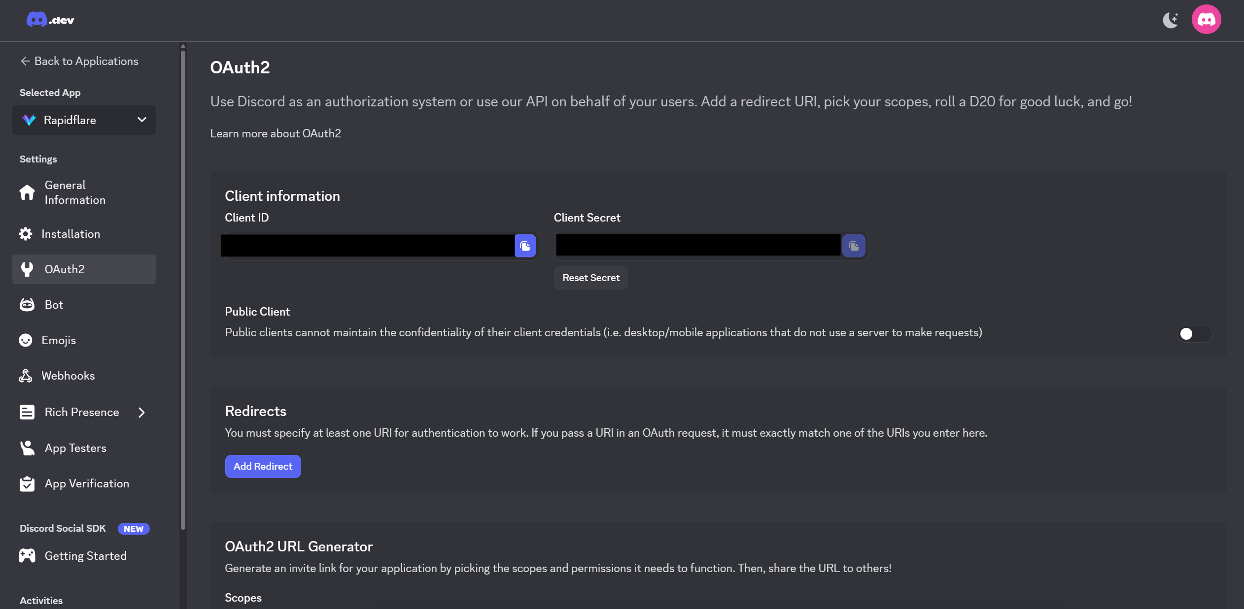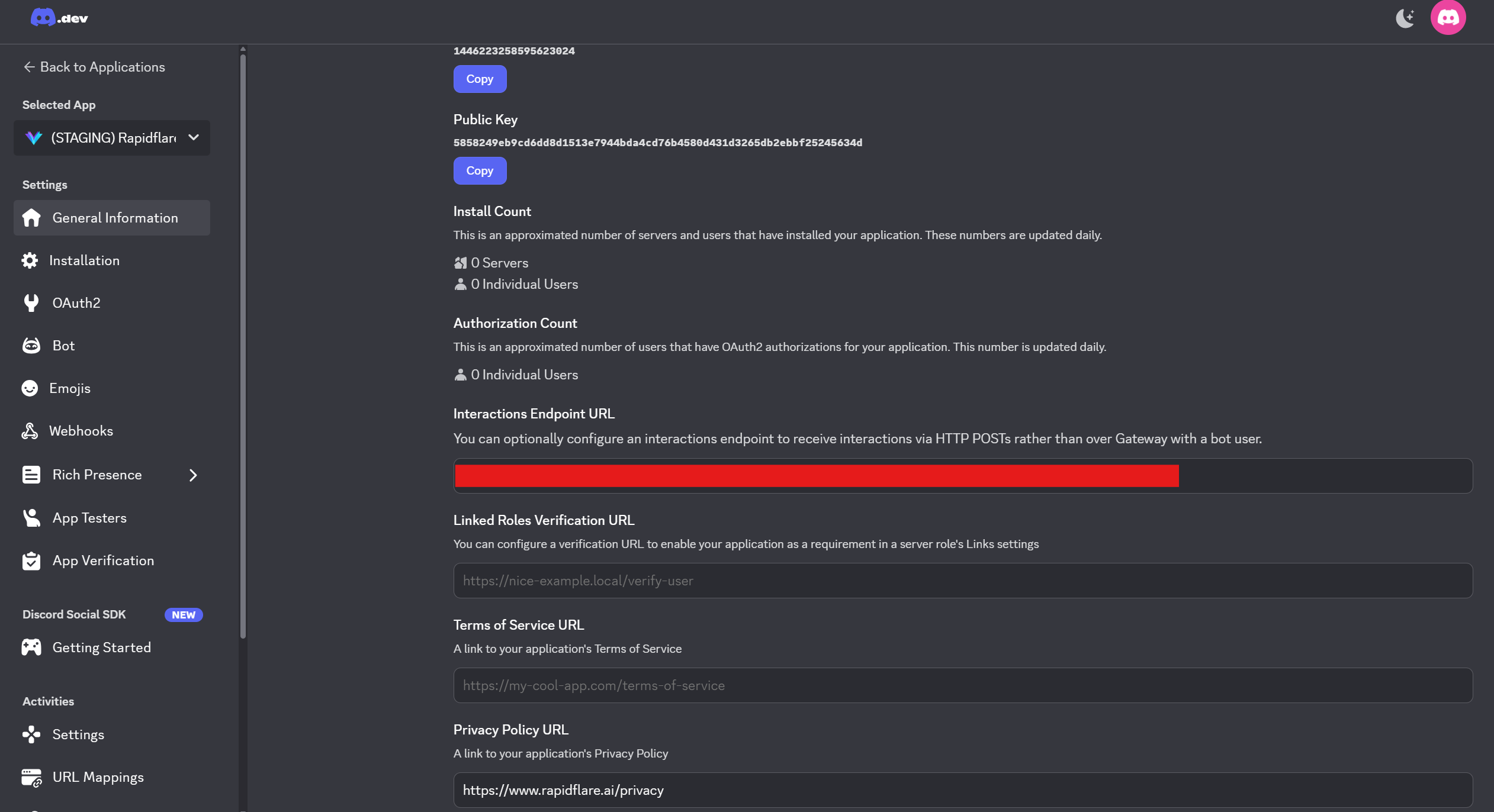 Go back to the Discord Developer Portal and configure these URLs. You can copy both URLs directly from the Rapidflare dashboard.