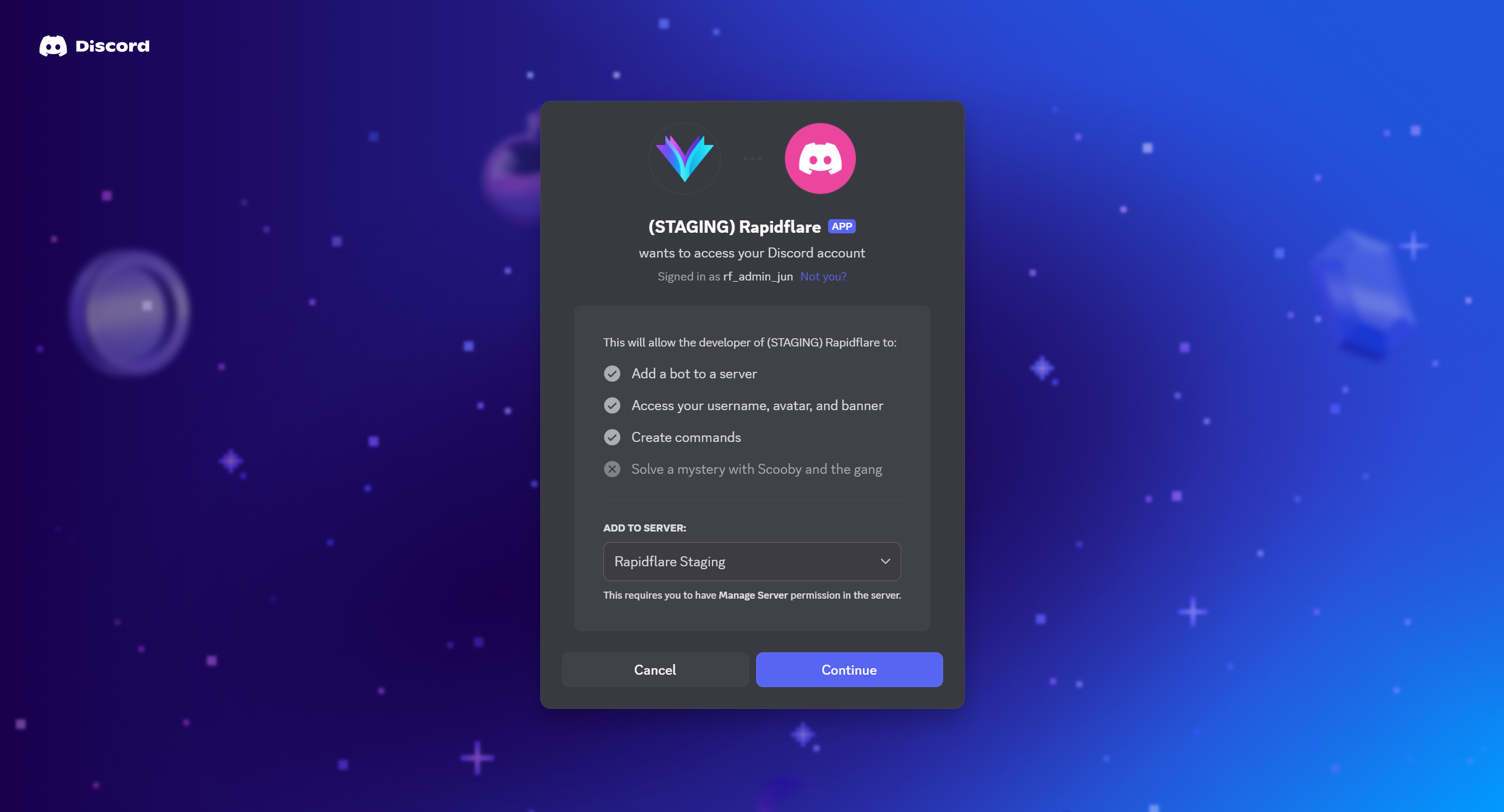 - After configuring the URLs in Discord, go back to the Rapidflare dashboard and click Continue.